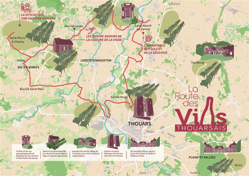 Venez à la découverte des particularités du vignoble Thouarsais. Entre amis, famille ou en couple, passez du bon temps sur la Route des Vins Thouarsais : un circuit de 50 km parsemé de haltes d'information. Son parcours serpente au milieu des vignobles et du Thouet permettant de belles balades. N'oubliez surtout pas de vous arrêter chez l'un de vos vignerons, qui vous expliquera sa manière de travailler et vous fera goûter le fruit de son art. Pour la pause déjeuner, n'hésitez pas à pique-niquer dans les vignes ou profitez des bonnes adresses de restaurants du territoire, pour allier les vins du Thouarsais avec une bonne assiette.