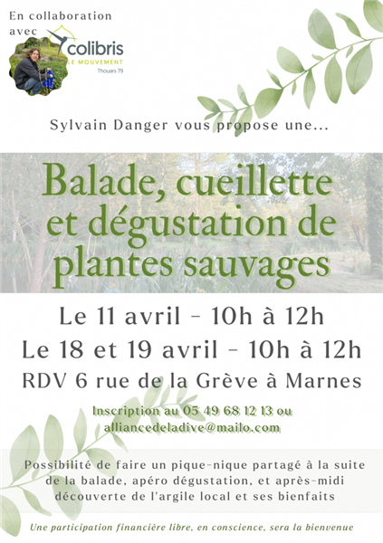 Sylvain DANGER vous propose une immersion dans la nature Thouarsaise à travers une balade pendant laquelle vous cueillerez des plantes sauvages que vous DÉGUSTEREZ ! Oui, oui vous avez bien lu.... Certaines plantes sauvages se mangent, apprenez à les reconnaitre. Possibilité de faire un pique-nique partagé au terme de la balade, apéro dégustation. Poursuivez votre après-midi par la découverte de l'argile locale et ses bienfaits.
