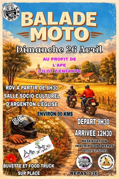 Enfourchez votre moto ! Cheveux au vent, découvrez ou redécouvrez le Thouarsais avec un parcours d'environ 90kms qui vous est proposé. Un ravitaillement est prévu.