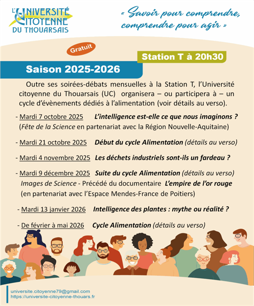 Conférence du cycle dédié à l'alimentation, il sera constitué d'une série de soirées se répartissant d'octobre à avril 2026. "Bien" manger : pour qui, pour quoi, comment ? "Les microbes ont-ils bon goût" Organisé par l'Université Citoyenne du Thouarsais en collaboration avec la Communauté de Communes du Thouarsais.
