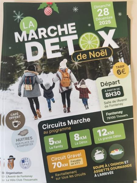 L'Avenir de Fontenay et le Vélo Club Thouarsais organise la rando détox de Noël. 3 circuits de marche (5; 8 et 12kms) et un circuit Gravel de 70km. Des ravitaillements seront disponibles sur tous les circuits. Café offert et huîtres sur place ou à emporter