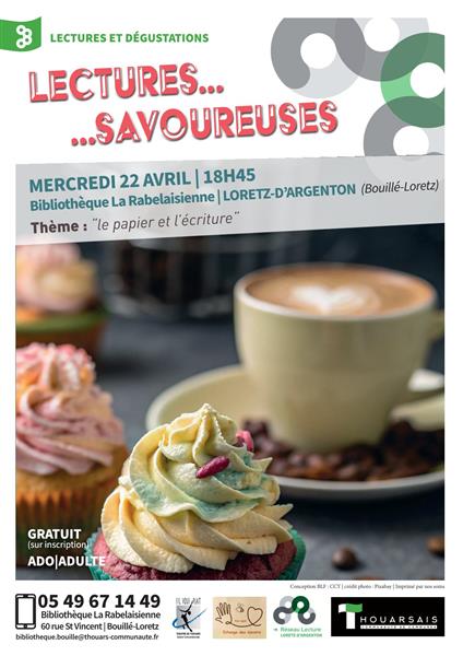 Lectures suivies de dégustations Thème : le papier et l’écriture. Venez savourez des textes spécialement choisis par l’association du théâtre de Thouars, puis déguster un buffet proposé par l’association l’Échange des Savoirs de Bouillé-Loretz dans un décor spécial pour l'occasion. On va régaler vos oreilles, vos yeux et vos estomacs...