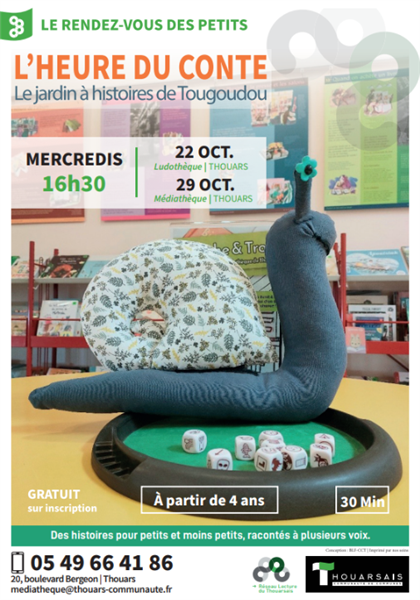 Viens retrouver ta mascotte favorite “Tougoudou l’escargot” pour deux moments de lecture partagé. Ton ami, accompagné par des bibliothécaires, te feront voyager à travers des “histoires à jouer”. Sur inscription - à partir de 4 ans