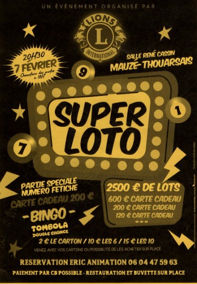 Le Lions Club de Thouars vous invite à participer à son super loto ! Venez profiter de ce moment convivial et remporter de nombreux lots ! Venez avec vos cartons (possibilités de les acheter sur place) Réservation Eric animation (06 04 47 59 63) - buvette et restauration sur place