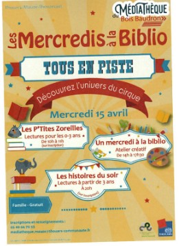 Venez découvrir l'univers du cirque à travers une journée riche en atelier à la médiathèque ! de 10h à 11h - Les P'Tites Zoreilles, lectures pour les 0-3 ans puis de 14h à 17h30 - atelier créatif et enfin à 20h - les histoires du soir (à partir de 3 ans) Sur inscription