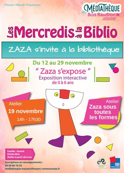 La médiathèque du Bois Baudron (Mauzé-Thouarsais) te propose de découvrir Zaza... un drôle de personnage né d'un cercle, d"un carré et d'un triangle à travers une exposition interactive du 12 au 29 novembre et lors d'un atelier créatif le 19 novembre.